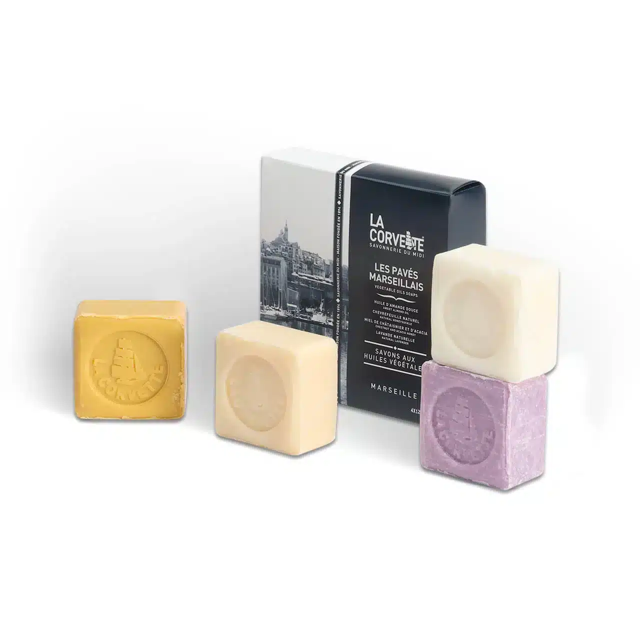 Набор Les Pavés Marseillais включает 4 мыла, состоящих из 100% растительных масел, с тонкими прованскими ароматами: